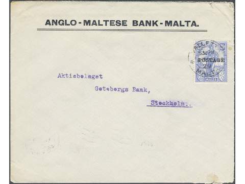 Malta. Michel 106 on cover, Malta 1926 POSTAGE overprint on Malta and Britannica 2½ d ultramarine. Beautiful cover sent from VALETTA MALTA 15.AP.29 to Sweden. Arrival pmk STOCKHOLM 16 20.4.29.
