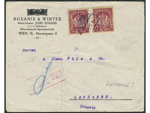 Austria. Michel 188 cover , 2×10 h with perfins R&W on censored cover sent from WIEN 3.11.17 to Switzerland. Arrival LAUSANNE FACT. LETTR. 9.XI.17 and LAUSANNE 1 EXP- LETTR 10.XI.1917.