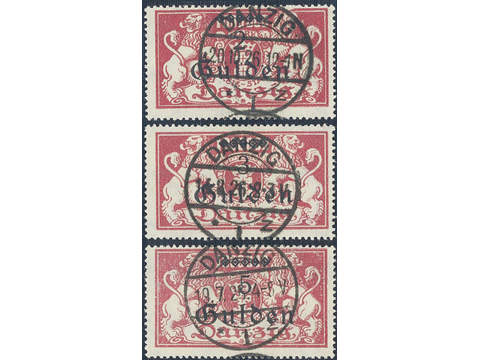 Germany Danzig. Michel 190–92 used , 1923 New value overprint high values 2, 3 and 5 gulden (3). All signed STOYE BPP. Beautiful cancellations. EUR 975