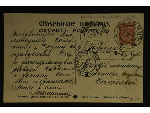Soviet Union. Michel 65 on cover, Post card franked with 3 k. Different cancels 1912.
