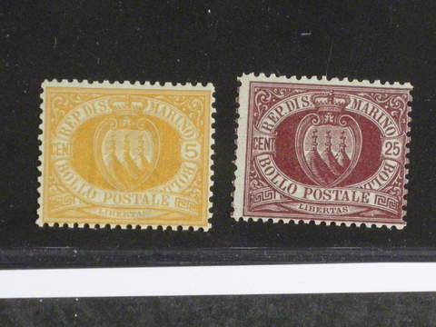 San Marino. Michel 6–7 ★ , 1890 Coal-of-Arms. Very fine copies with small hinge remnants. EUR 280