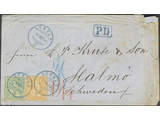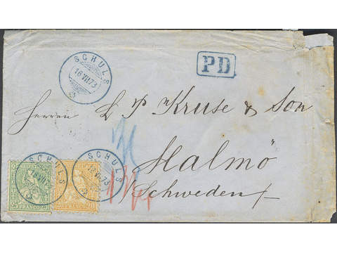 Switzerland. Michel 32, 24 cover , Sitting Helvetia 25 c green on white paper and 20 c orange on white paper on cover of lowest rate sent to Sweden, cancelled SCHULS 16.7.73. Several transit notes and cancellations including arrival in Malmö 20.7.1873.