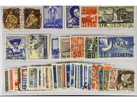 Switzerland. Used 1908–45. All different, e.g. Mi 108, 127, 297, 309-10, 324, 362, 394, 434, 438, 452-455. Mostly good quality. Mi € 705 (39)