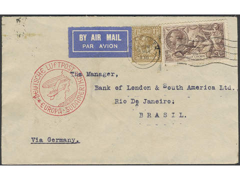 Britain. Michel 186 cover, Franked with 2s6d and 1s Sent by zeppelin to Brazil 1936 bearing red DEUTCHE LUFTPOST EUROPA - SÜDAMERIKA cancel alongside.