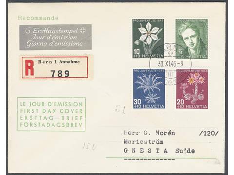 Switzerland. FDC Michel 475–78 , 1946 Pro Juventute. Addressed FDC with traces of mounting on back, otherwise fine. EUR 170