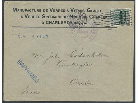 Germany Landespost in Belgium. Michel 2 cover , 1914 New value overprint 5 c / 5 pf green. Printed matter sent from BRUSSEL BRUXELLES 1.IX.1915, VIA AACHEN, to Sweden. Arrival pmk ÖREBRO 2.TUR 5.9.15.