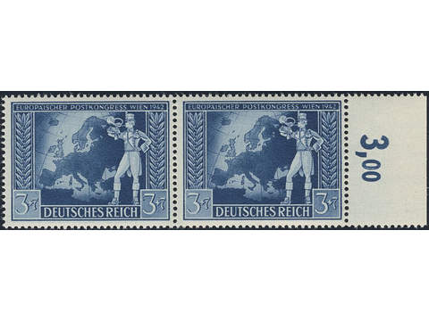 Germany, Reich. Michel 820 III ★★, 1942 Post Congress 3+7 pf dull ultramarine with coloured spot to the left of right "3" variety (pos 29 in some sheets), in pair with other stamp. Signed SCHLEGEL BPP. EUR 160
