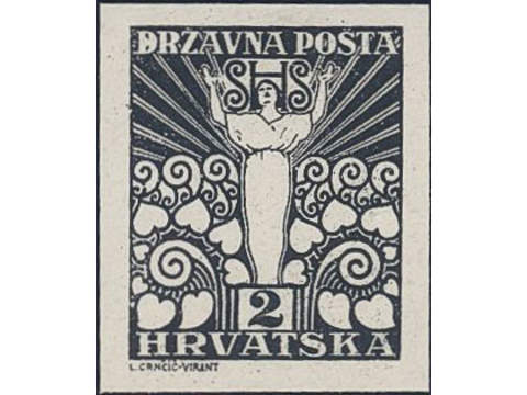 Yugoslavia. Michel 88 (★), 1919 2 f black imperf proof on carton paper. Cert by Zrinjscak 2012.