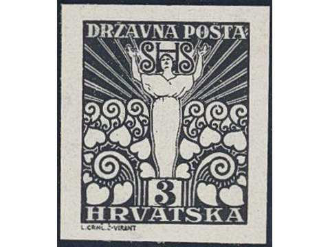 Yugoslavia. Michel 89 (★), 1919 3 f black imperf proof on carton paper. Cert by Zrinjscak 2012.