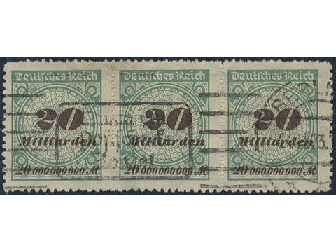 Germany, Reich. Michel 329BST IV used, 1923 Inflation numerals 20 Miliarden M opal-green/blackish ochre-brown rouletted. Nice strip of three with a few short perfs at top. Befund by Dieter Weinbuch. EUR 15