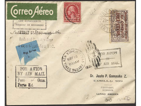 Thematics First flights. Covers. Guayaquil - New York 29 April 1930. Franked with One Ecuador stamp (with damage) and 2 c American stamp. Several cancels at front and reverse.