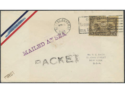 Canada. Michel 127 on cover, 5 cents (def) on cover to USA, sent from NASSAU Bahamas 19.4.29+ violet MAILED AT SEA.