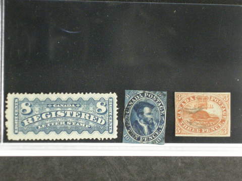 Canada. Used. 1852-57 imperfs: 3d beaver used with three margins, highly presentable with no faults (SG.8), 10d blue Cartier SG.15, used with faults, plus the 8c blue registration stamp unused, closed tear. Cat. £2,400.