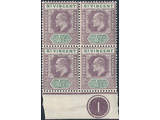 Saint Vincent. Michel 53 ★★, 1902 King Edward VII 1/2 penny lilac/green in block of four with plate number 1. Stamps are never hinged, mounted in margin.