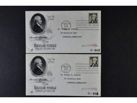 U.S.A. FDC, Michel 675, 1956-03-19. Famous Americans and buildings $5 black-olive, two FDCs sent registered to STAMFORD CONN. 26.MAR.1956. (2). EUR 100
