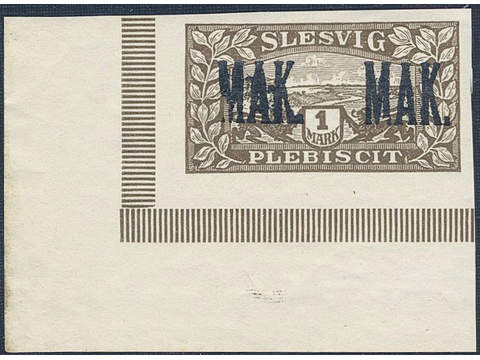 Denmark Schleswig. Facit 11 or Scott 11 ★★ , 1920 Lion and Landscape 1 Mark brown imperf margin copy with MAK overprint in black. Mi 11P2. Signed E Ludin on back. Scarce never hinged!