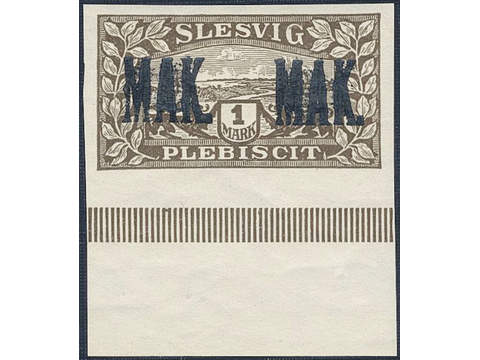 Denmark Schleswig. Facit 11 or Scott 11 ★★ , 1920 Lion and Landscape 1 Mark brown imperf margin copy with black MAK overprint. Mi 11P2. Signed E Ludin. Scarce never hinged.