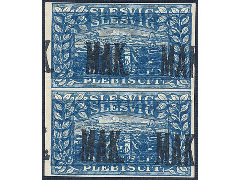 Denmark Schleswig. Facit 12 or Scott 12 (★) , 1920 Lion and Landscape 2 Mark blue double printed with black MAK overprint in pair. Mi 12P2.