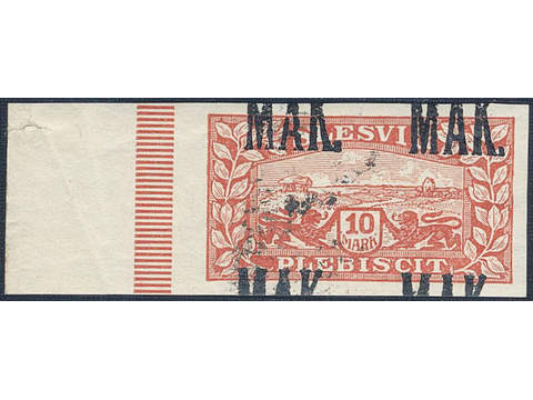 Denmark Schleswig. Facit 14 or Scott 14 ★★ , 1920 Lion and Landscape 10 Mark red imperf margin copy with black MAK overprint. Mi 14P2. Scarce never hinged.