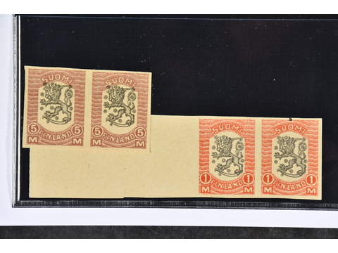 Finland. Facit 82–83 (★), 1918 Temporary wartime issues 1 and 5 Mk in imperforated pairs. Scarce.