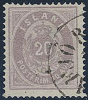 Iceland. Facit 14a used, 1876 Aur values 20 aur pale violet blurred print perf 14 × 13½. …