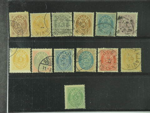 Iceland. Used 1873–1901. All different, e.g. F 3PT, 8, 11, 13, 15, 17, 21–22, 28–29. Mostly good quality. F SEK 5.040 (13)