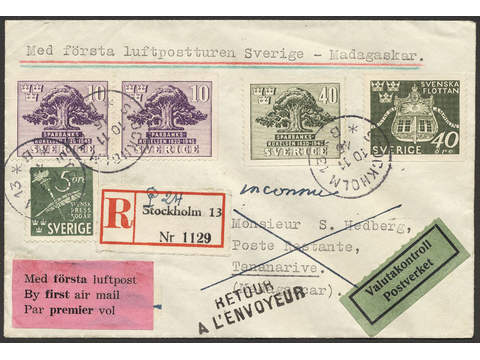 Sweden. Facit 356 etc. cover , Luftpostbrev till Madagaskar sänt med första flyg, stämplat STOCKHOLM 13 10.11.45. Frankerat med 105 öre totalt. Sällsynt.