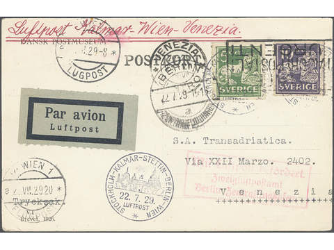 Sweden. Facit 143A, 145A cover , Airmail printed matter to Italy, sent STOCKHOLM-KALMAR-VIENNA-VENICE 22.7.29.
