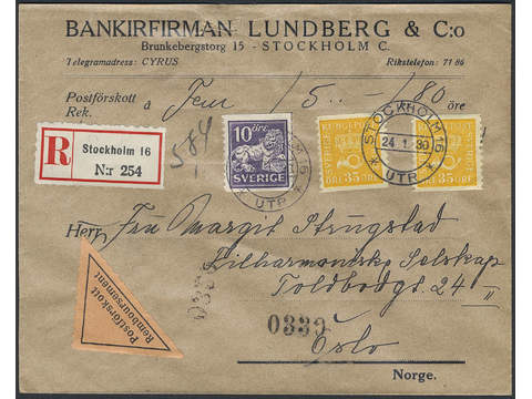 Sweden. Facit 145A, 157 cover, 10+2×35 öre on registered cash on delivery cover sent from STOCKHOLM 16 24.1.30 to Norway. Arrival pmk OSLO 25.1.30. Foreign C.O.D. mail is scarce.
