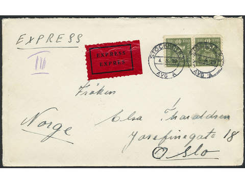 Sweden. Facit 159 on cover, 2×40 öre på expressbrev sänt från STOCKHOLM 3 4.5.29 till Norge.