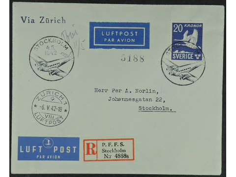 Sweden. FDC Facit 337C , 1942 Flying Swans 20 Kr blue, perf on four sides on airmail FDC cancelled STOCKHOLM 4.5.1942.