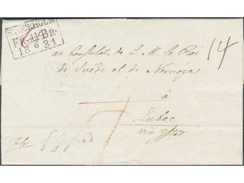 Sweden. Foreign-related cover. Germany. Free letter sent from STOCKHOLM FR BR 14.6.1831 to Lübeck. Cancellations FRCO GREIFSWALD (P: +1500), KSNPC I GREIFSWALD D. 18 JUNI (P: 3000) and KS&NPC HAMBURG 20.JUN.31. EARLIEST RECORDED mail to the Free and Hanseatic City of Lübeck (1815–1937) according to the listing by Sören Andersson. Superb.