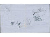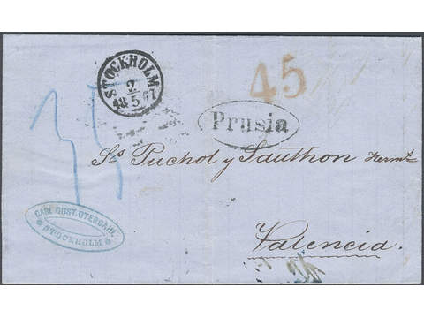 Sweden. Foreign-related cover. Spain. Unpaid letter (weak archive fold) sent from STOCKHOLM 2.5.1867, in German sealed pouch to Saarbrücken, via Belgium and France to Irun, Madrid and Valencia. Cancellations STRALSUND BERLIN 3.5, PRUSIA, VALENCIA 10.MAY.67. Accountancy note "35" (foreign postage in quartos) and postage due mark 45 (quartos).