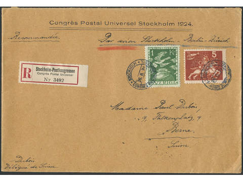 Sweden. Facit 223, 211 cover , 5 öre + 1 kr on registered airmail cover sent from STOCKHOLM CONGRES POSTAL UNIVERSEL 26.8.24 to Switzerland. SEK 9000