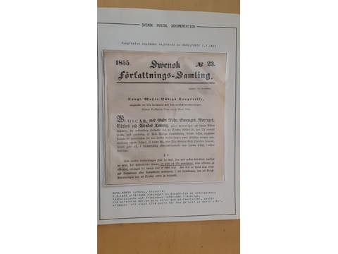Sweden. Postal documentation. Svensk Författnings-samling No. 23 1855 on old exhibition page. The official announcement about the introduction of the uniform postal rate and the Skilling Banco stamps. Sought-after.