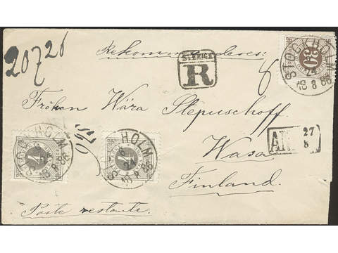 Sweden. Facit 29e (x2), 47a cover , 4 öre deep grey-grey on calendered paper in two copies together with 30 öre olivish brown with posthorn on registered cover of lowest rate sent to Finland. Cancelled STOCKHOLM 24.8.1886. Scarce combination, only recorded of this combination.