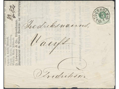 Sweden. Facit 30e cover , 5 öre pale bluish green on printed matter of lowest rate sent to Norway. Beautiful cancellation STOCKHOLM L:L: 21.4.1882. Exhibition item!