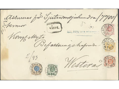 Sweden. Facit 30f, 33d, 34e, 36e, 38d cover , Beautiful five colour franking on insured inland cover of second rate insured for 7700 kronor, cancelled STOCKHOLM LGL 14.3.1883. Unique combination according to Ferdén.
