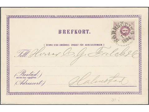 Sweden. Facit 31i cover , 6 öre red-lilac on soft paper on inland post card, cancelled NORRKÖPING 9.12.1884. Fresh and attractive appearance.