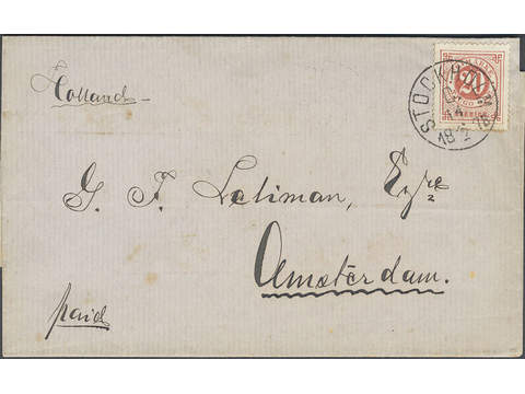 Sweden. Facit 33a cover , 20 öre carminish red - dull red on cover of lowest rate to Netherlands, with beautiful cancellation STOCKHOLM C 14.6.1878.