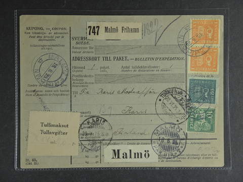 Sweden. Facit 165, 168, 144A cover , 10+80 öre + 2x1 kr on address card for parcel sent from MALMÖ FRIHAMN 18.6.25 to Finland. CAncellations MALMÖ PAK UTR T 18.6.25, TURKU ÅBO 20.VI.25 and KARIS 20.6.25.