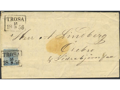 Sweden. Facit 2 on cover, Cover with EXCELLT cancellations TROSA 16.9.1856, sent to Örebro.