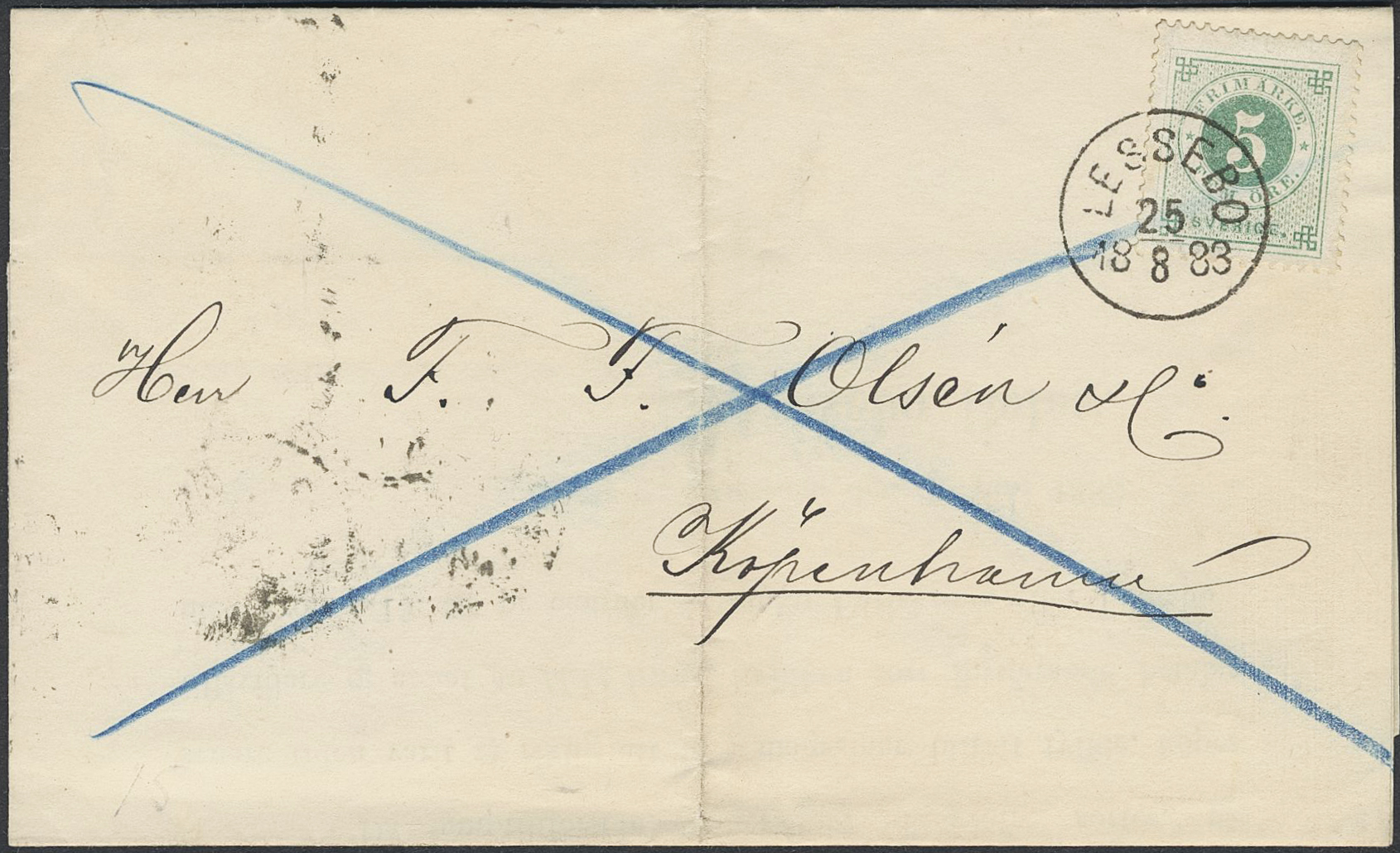 Sweden. Facit 30 on cover, 5 öre on beautiful printed matter sent from LESSEBO 25.8.1883 to Denamrk. Arrival pmk K.OMB 1 27.8.83.