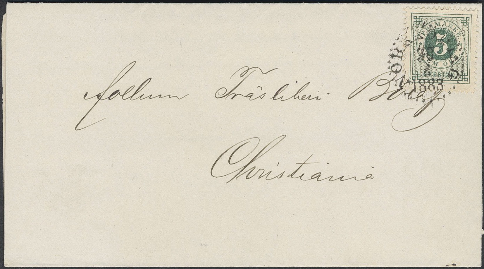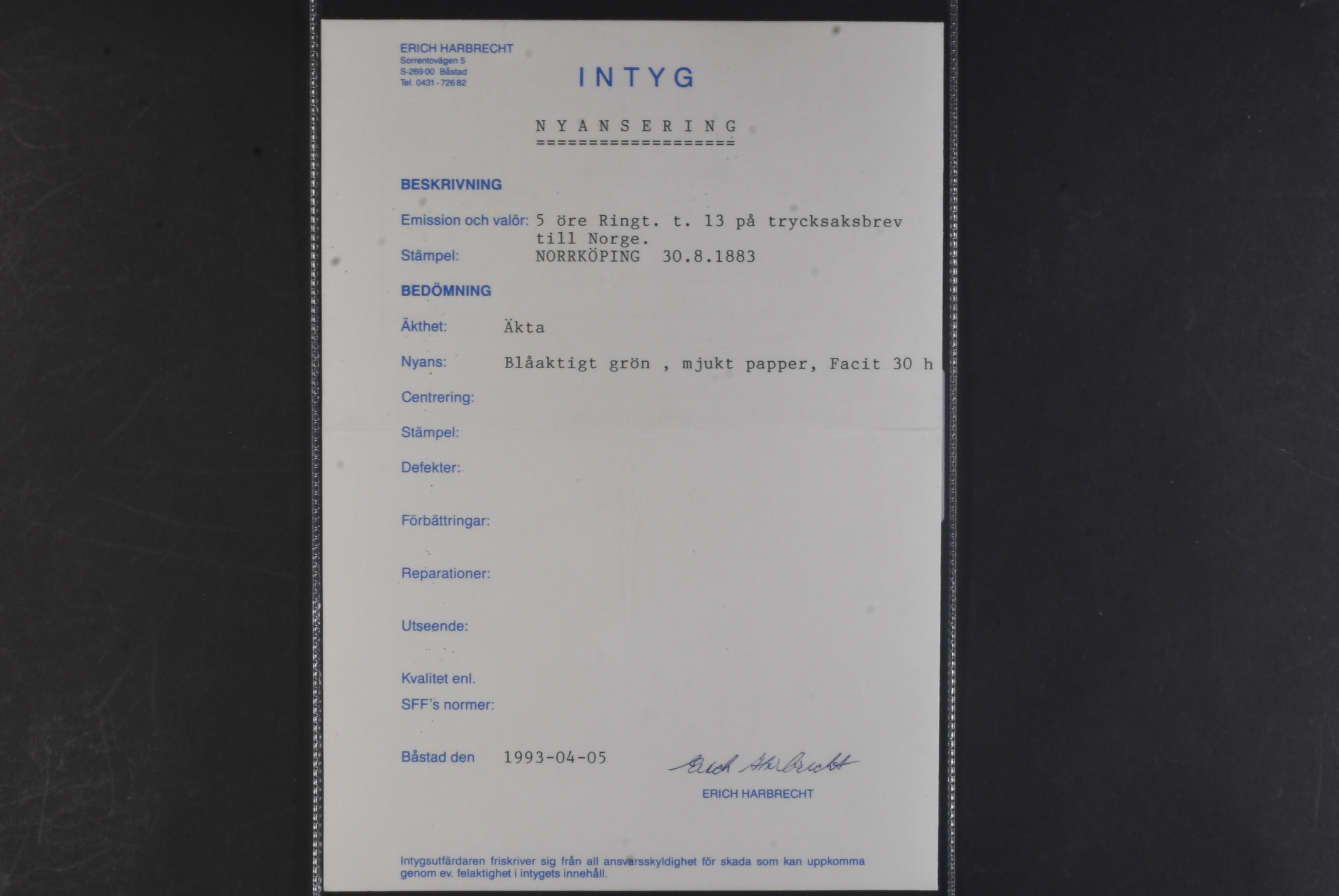 Sweden. Facit 30h on cover, 5 öre bluish dark-green on soft paper. Printed matter sent from NORRKÖPING 30.8.1883 to Norway. Opinion (shade) by Erich Harbrecht.