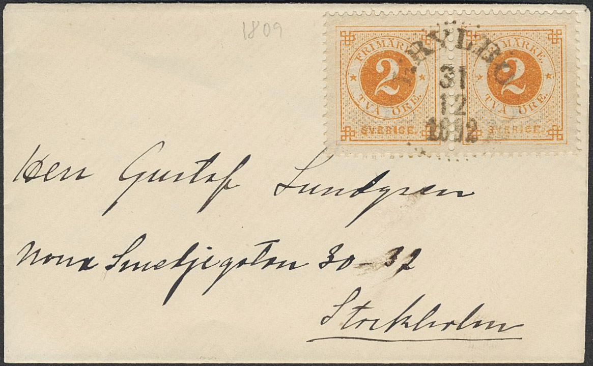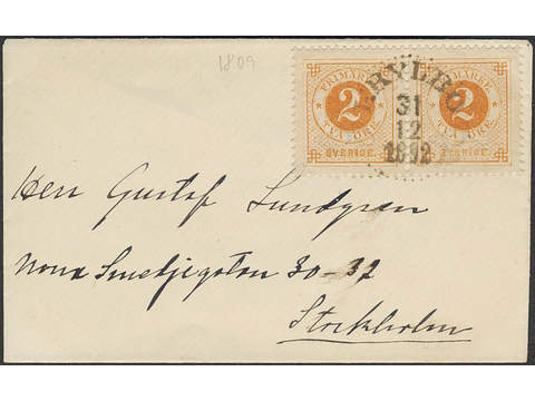 Sweden. Facit 40b on cover, 2 öre orange in pair on domestic printed matter of lowest rate. Superb cancellation KRYLBO 31.12.1892.