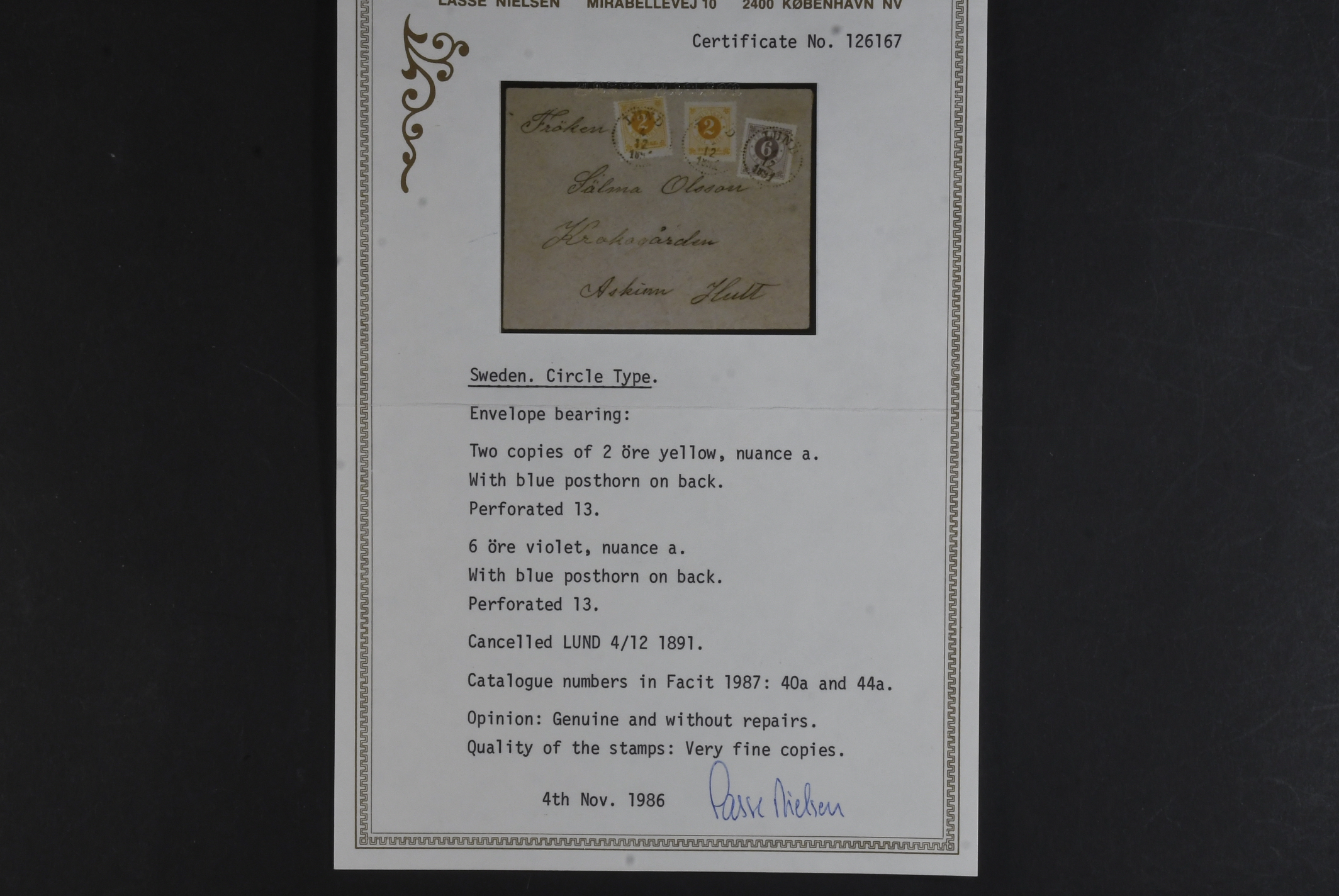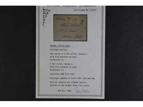 Sweden. Facit 40b (x2), 44b on cover, 2 öre orange in two copies and 6 öre red-lilac on yellowish paper and inland cover of lowest rate cancelled LUND 4.12.1891. Certificate Nielsen included.