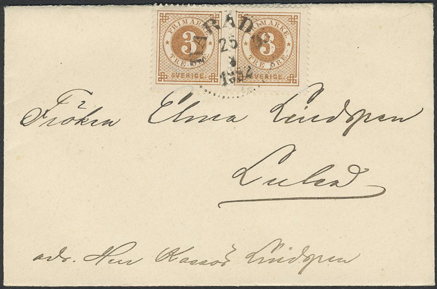 Sweden. Facit 41a on cover, 3 öre yellowish brown in pair on domestic printed matter of lowest rate (overpaid 1 öre), beautiful cancellation HARADS 25.3.1892.