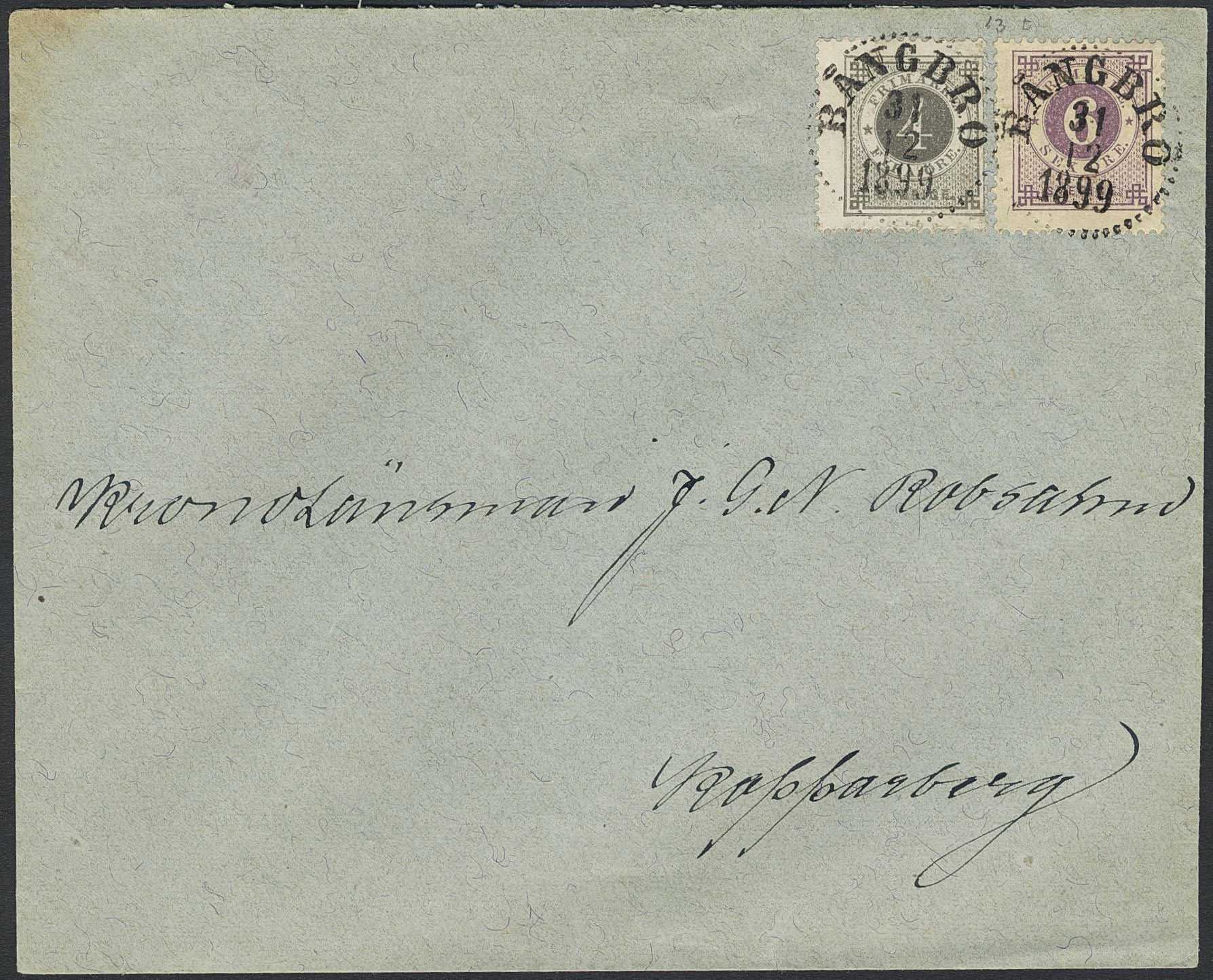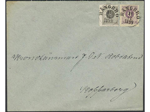 Sweden. Facit 44c, 42a on cover, 6 öre dark red-lilac and 4 öre deep grey on domestic cover of lowest rate with excellent cancellations BÅNGBRO 31.12.1899.