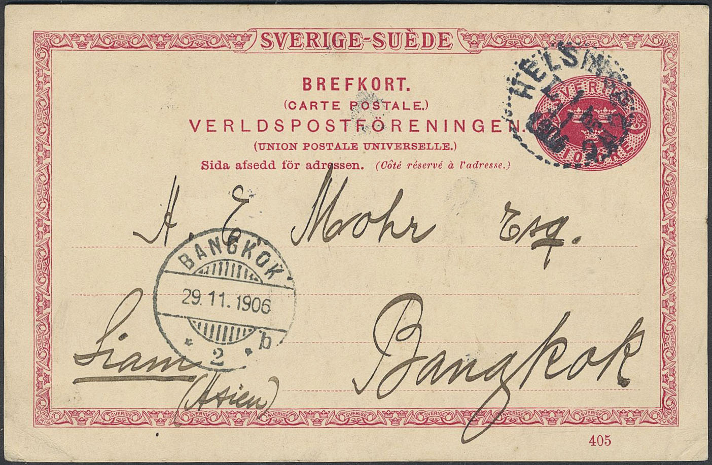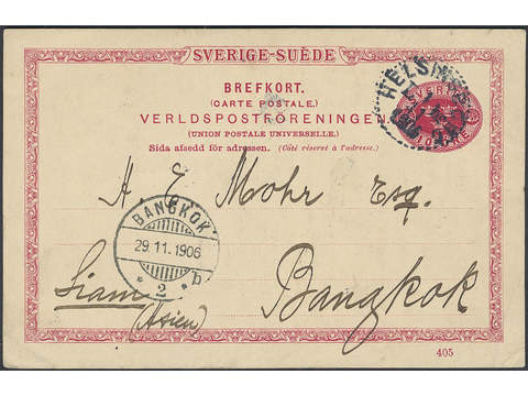 Sweden. Postal stationery, Single postcard, Facit bKe14/405, Postcard 10 öre sent from HELSINGBORG LBR 1.11.1906 to Siam, with arrival pmk BANGKOK 29.11.1906.