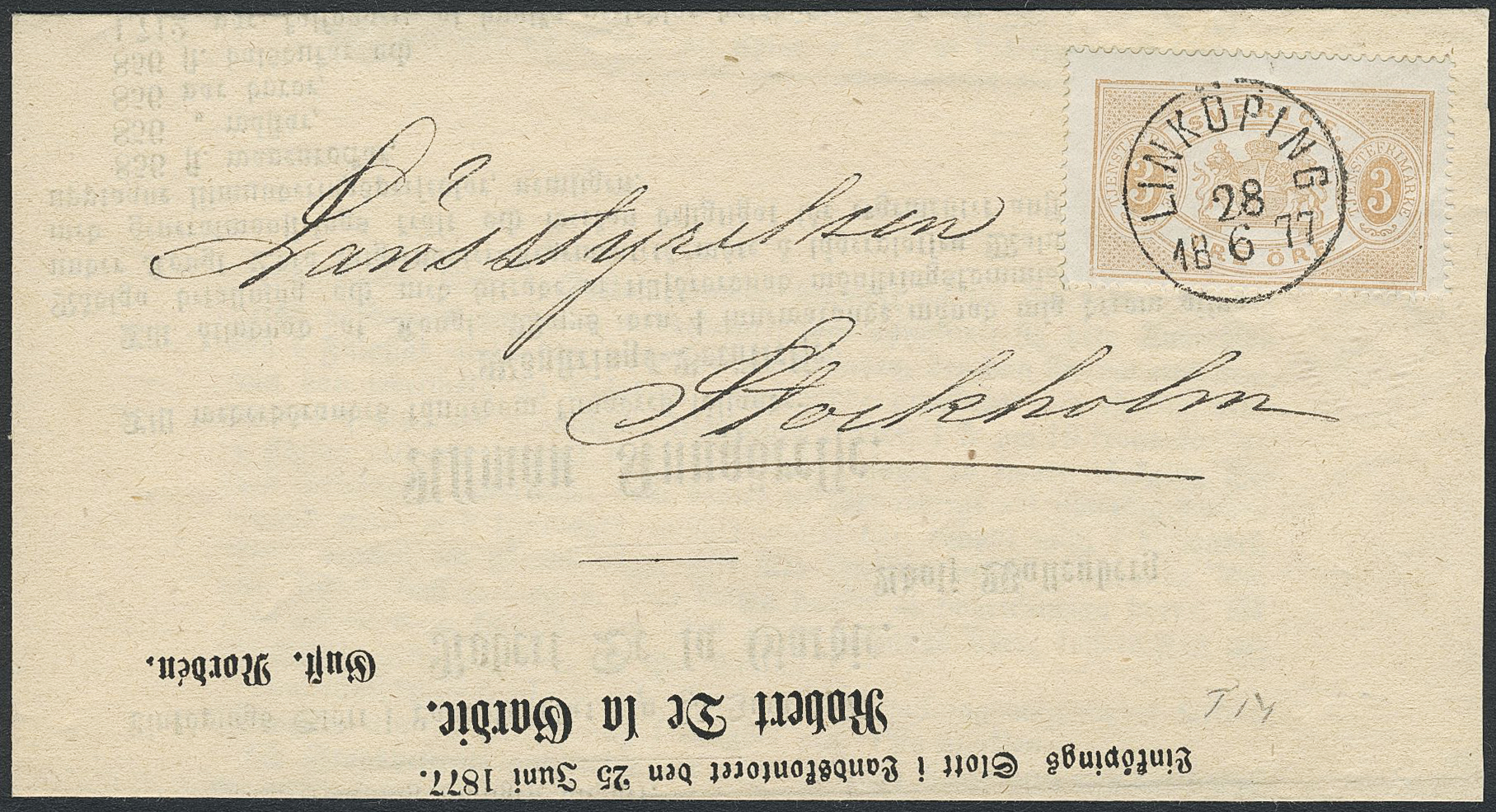 Sweden. Official Facit Tj1c , 3 öre gråbrun, tandn 14 på trycksak med LYX-stämpel LINKÖPING 28.6.1877.